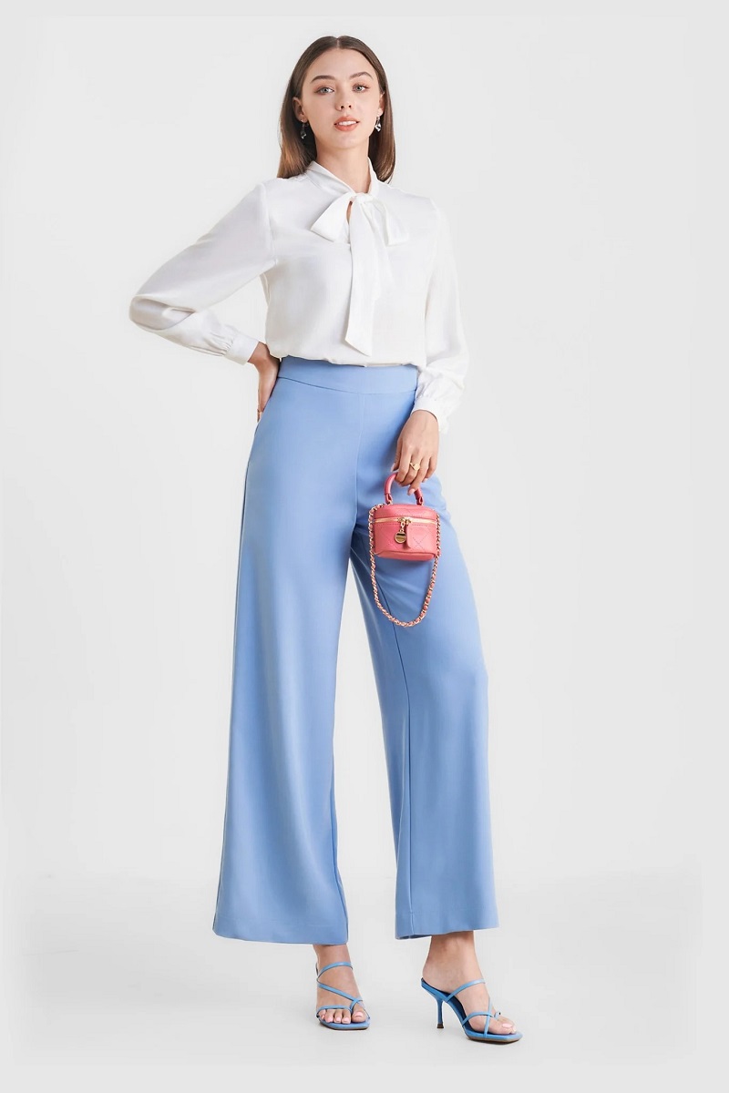 Áo sơ mi cổ nơ phối cùng quần ống rộng