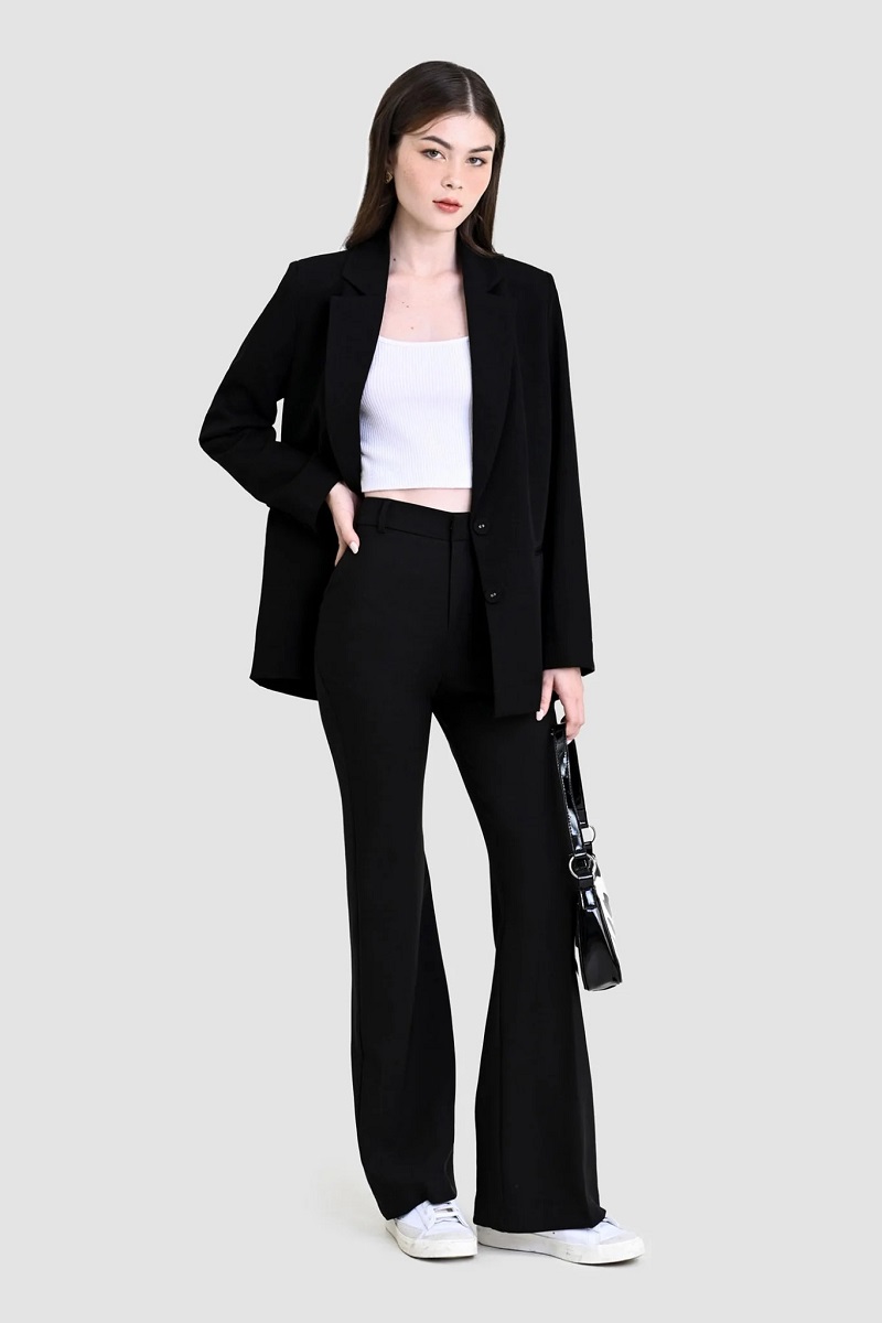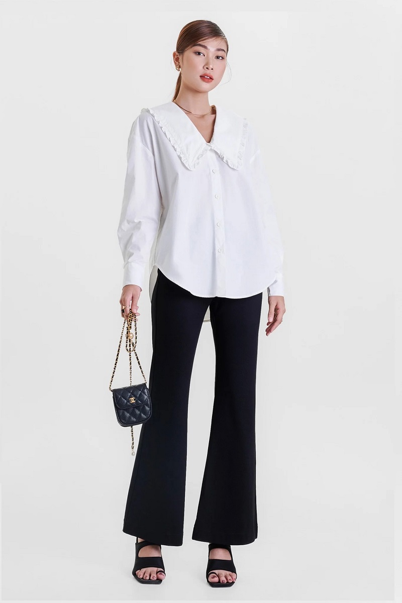 Với cách phối đồ này, bạn sẽ có được vóc dáng trông thon gọn hơn và cao ráo hơn. Áo sơ mi kết hợp cùng quần ống rộng mang đến sự nhẹ nhàng, thoải mái và khá phù hợp với nhiều vóc dáng, đặc biệt phù hợp với những cô nàng công sở.