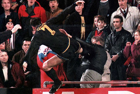 Hôm ấy diễn ra một trong những sự kiện tăm tiếng nhất trong lịch sử vẻ vang bóng đá. Eric Cantona tung cú song phi vào một cổ động viên của Crystal Palace. Cầu thủ người Pháp rồi sẽ bị treo giò 8 tháng vì hành vi này. Nhưng đêm đó, trong phòng thay đồ, Sir Alex có vẻ như chỉ chăm sóc tới việc Man United đánh rơi 2 điểm. Theo lời kể, ông hằm hằm đi vào và quăng đủ thứ “ rau củ quả ” vào những cầu thủ Pallister, Paul Ince, Lee Sharpe. Xong hết rồi ông mới nhẹ nhàng quay sang Cantona, hạ giọng : “ Eric … không hề cứ loanh quanh rồi làm bậy thế được đâu, con trai ” .