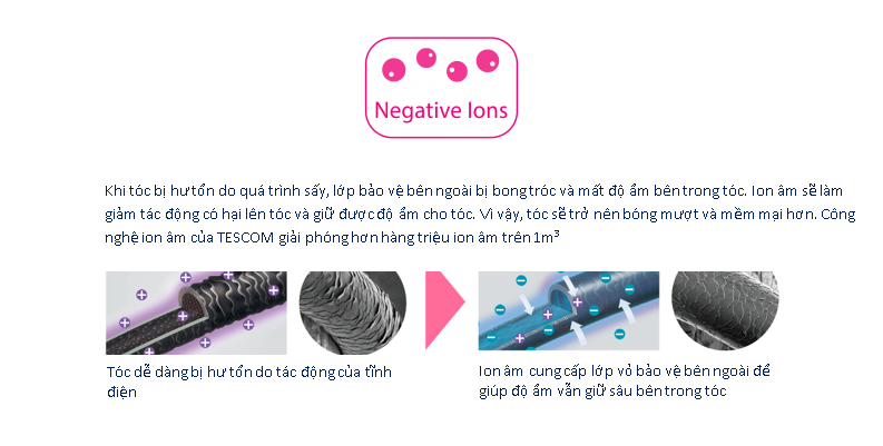 • Tóc hư tổn khô xơ càng tích tụ nhiều ion dương (+) khiến tóc dễ đứt gãy chẻ ngọn. TESCOM cung cấp dưỡng chất ion âm (-) thẩm thấu vào từng nang tóc giúp cân bằng ion, cân bằng độ ẩm