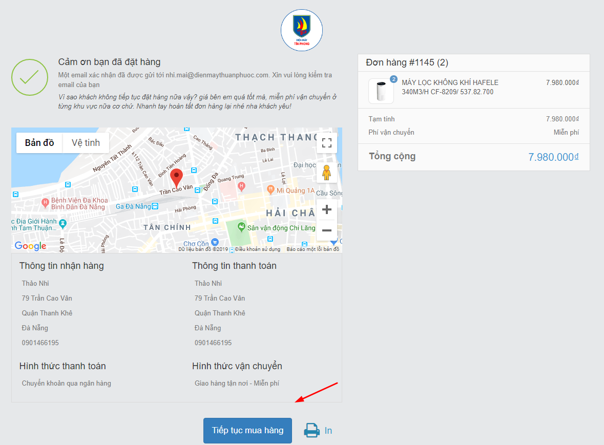 Sau khi triển khai đặt hàng, hành khách sẽ nhận được mail cảm ơn khi đã tin yêu sử dụng loại sản phẩm của Điện máy Tín Phong cũng như mail xác nhận thông tin đơn hàng của mình .