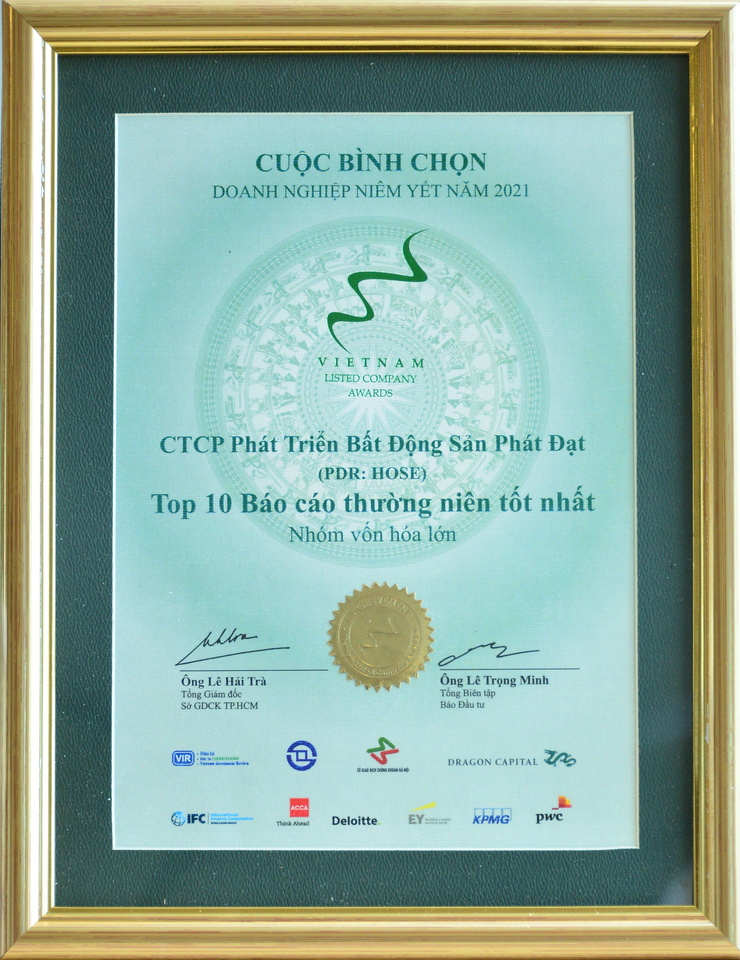 Công ty CP Phát triển Bất Động Sản Nhà Đất Phát Đạt vinh dự đạt giải nhất trong Top 10 báo cáo giải trình thường niên tốt nhất năm 2020, nhóm vốn hóa lớn, nằm trong khuôn khổ Cuộc bầu chọn Doanh nghiệp niêm yết được báo Đầu tư phối hợp cùng HOSE tổ chức triển khai thường niên năm 2021. Với chủ đề ” Bứt phá số lượng giới hạn “, Báo cáo thường niên 2020 của PDR bộc lộ niềm tin kiên cường trước những thử thách, cải tiến vượt bậc vượt những chỉ tiêu, chuẩn bị sẵn sàng chinh phục những tầm cao mới .