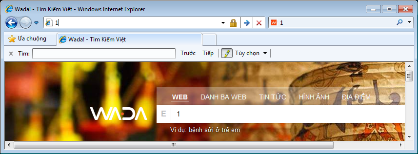 Khi đã thiết lập Wada.vn làm công cụ tìm kiếm mặc định trên trình duyệt, bạn có thể dùng Wada để tìm kiếm thông tin ngay từ khung địa chỉ mà không cần truy cập vào trang chủ Wada.vn.