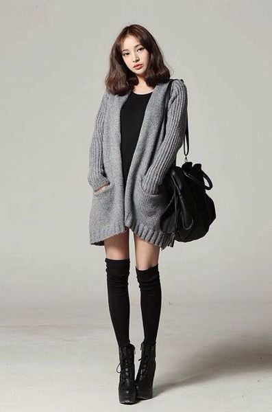 Công thức: Áo khoác len dày rộng + áo thun bó + quần short + tất đen dài + giày đế cao.