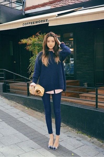 Công thức: Áo len chui đầu + áo sơ mi + quần jean bó + giày cao gót.
