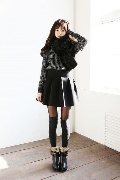 Công thức: Áo len chui đầu + khăn lông chữ nhật bản to + chân váy xòe + tất đen + bốt da cổ lông.
