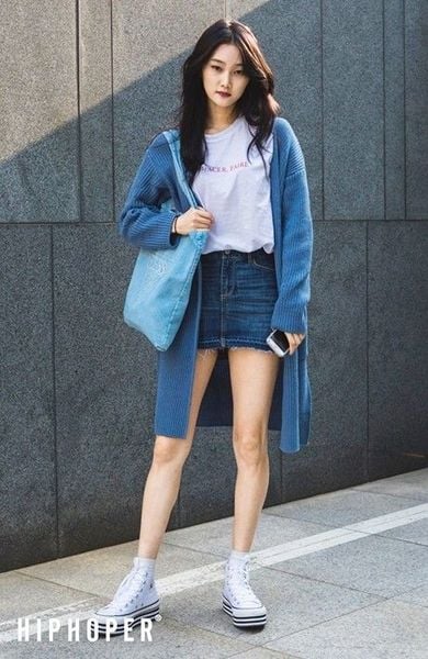 Công thức: Áo thun + chân váy jean ngắn ôm + áo khoác len dài + giày thể thao.
