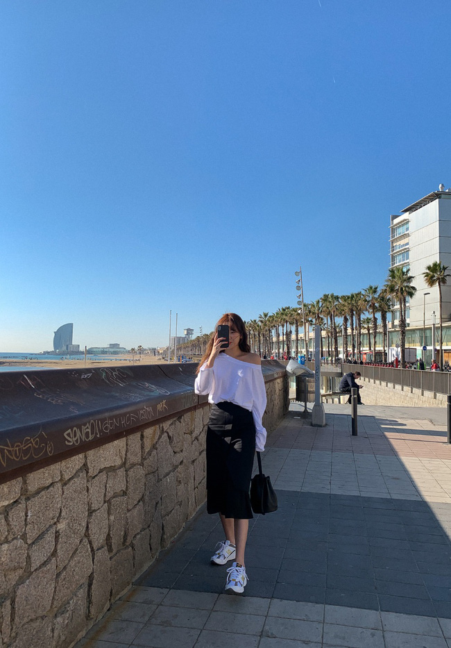 Bộ đôi áo phông thun lệch vai + chân váy ôm + giày sneaker có thừa độ tươi tắn, phong thái nhưng vẫn êm ả dịu dàng, điệu đàng lắm. Đừng quên sơ vin để tầm vóc được cải tổ nhé những nàng !