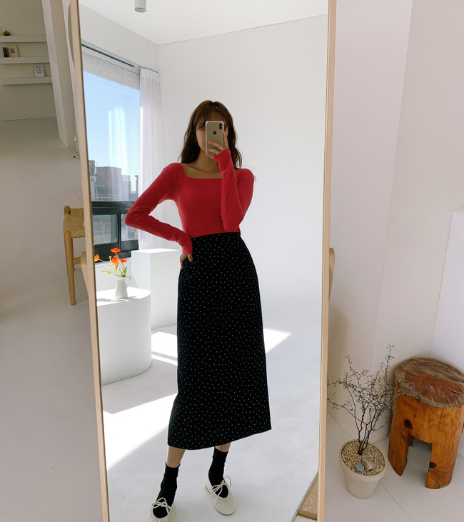 Mix chân váy đen với áo họa tiết chấm bi thì bạn khỏi lo mất điểm phong thái, thậm chí còn còn được khen mặc đẹp và có gu nữa đấy !