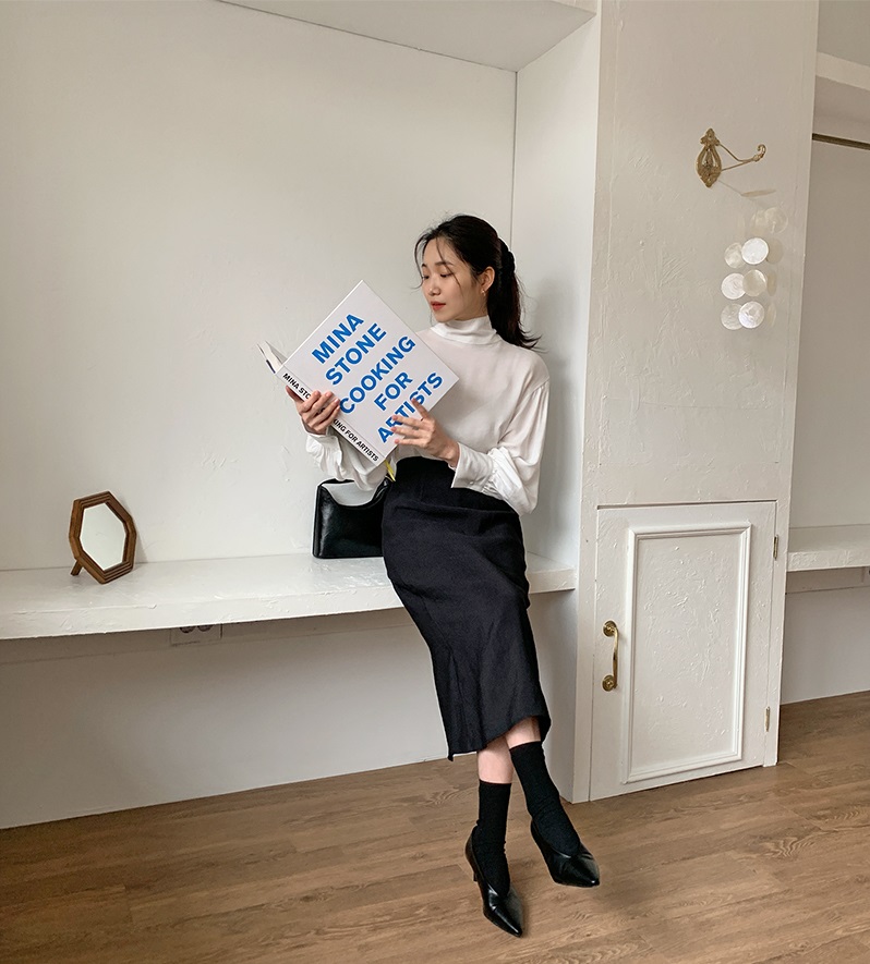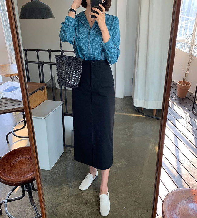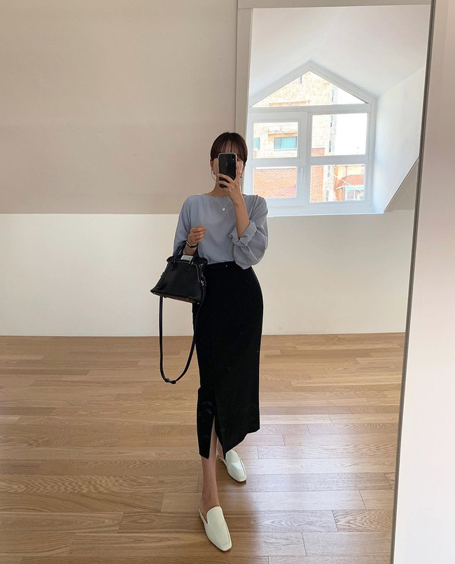 Diện chân váy đen, bạn trọn vẹn hoàn toàn có thể gây ấn tượng bởi vẻ bên ngoài lịch sự, ” quý tộc ” nếu mix với áo blouse cổ cao, tay bồng rồi kết lại bằng một đôi giày mũi nhọn như quý cô này .