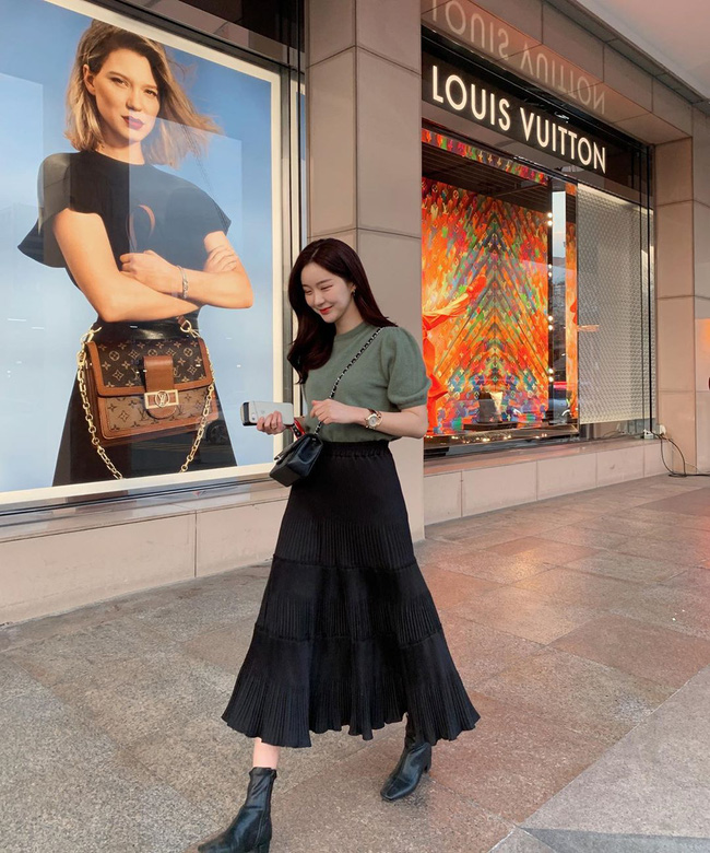 Chân váy xếp ly đen + áo cardigan + giày sneaker trắng là bộ 3 đơn thuần nhưng được nhìn nhận cực cao ở độ trendy, lịch sự .