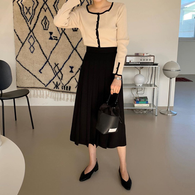 Không ai hoàn toàn có thể phủ nhận, bộ ba áo cardigan cổ vuông, chân váy xếp ly bản to và giày gót thấp rất lịch sự, lịch sự và trang nhã .