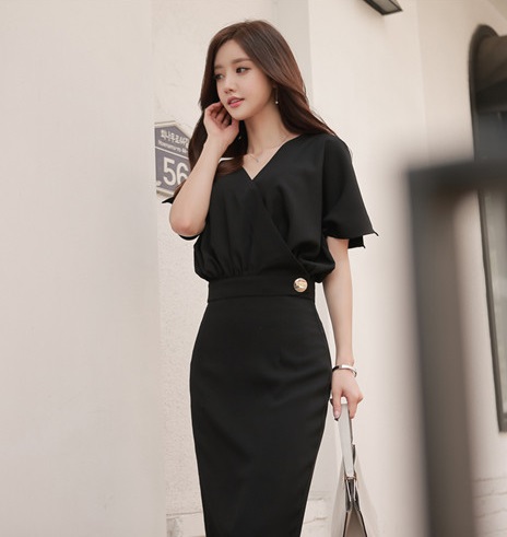 Đầm văn phòng Nước Hàn cổ chữ V xẻ tay
