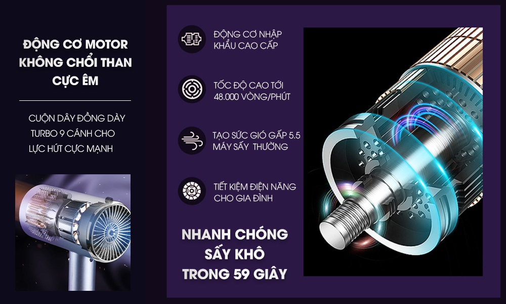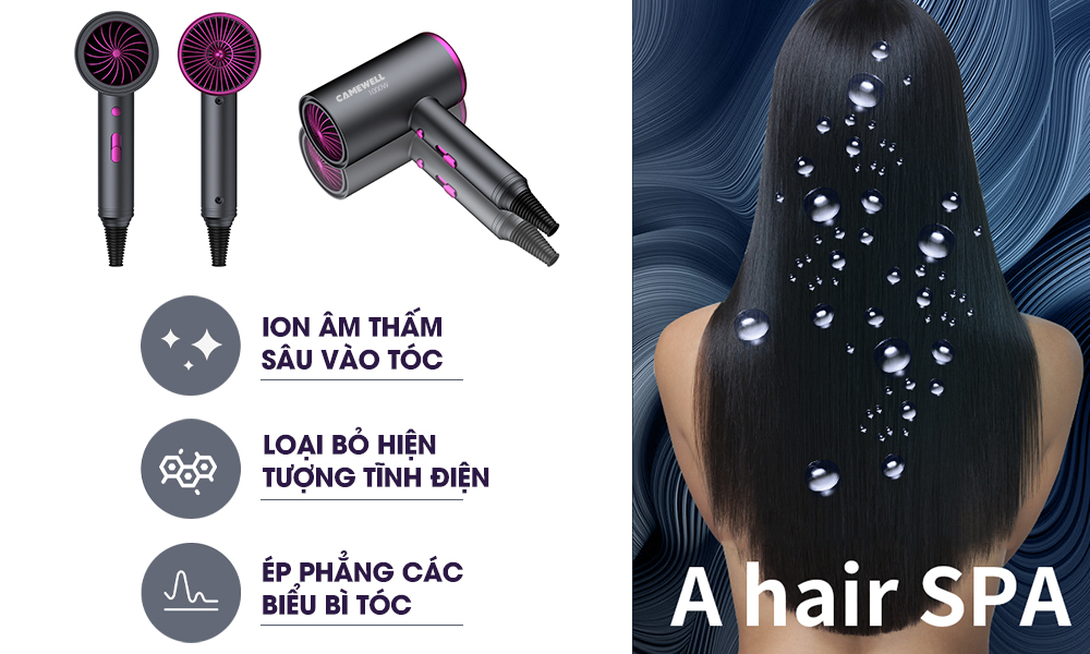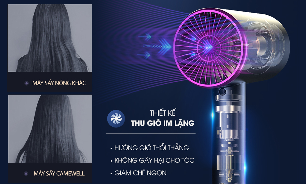 Máy sấy tóc mini Camewell sử dụng động cơ không chổi than mang luồng gió can đảm và mạnh mẽ để sấy khô nhanh hơn, tuổi thọ của máy lâu hơn. Cùng công nghệ tiên tiến ion âm cho mái tóc sau khi sấy mềm mịn và mượt mà, sáng bóng loáng, không xơ rối