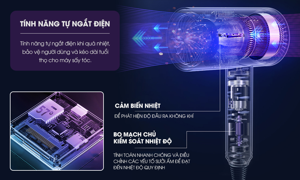 Máy có chính sách tự động hóa ngắt khi quá nhiệt bảo vệ bảo đảm an toàn khi sử dụng, đặc biệt quan trọng trường hợp quên tắt máy sấy. Dây cắm to, phích cắm chắc như đinh với chiều dài 150 cm .