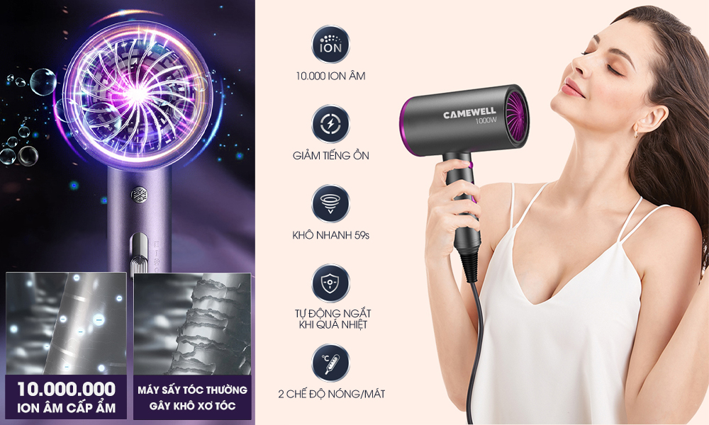 Công suất lên đến 1000W với động cơ tạo sức gió mạnh gấp 5.5 lần những dòng máy sấy hiệu suất lớn thường thì giúp làm khô tóc nhanh và tiết kiệm chi phí điện năng tối đa cho mái ấm gia đình, động cơ chạy êm, ngoài những máy sấy tóc 2 chiều nóng lạnh CW02HD còn có công nghệ tiên tiến tạo icon thấm sâu vào tóc giúp tóc bóng mượt không bị xoăn rối, vô hiệu hiện tượng kỳ lạ tĩnh điện .