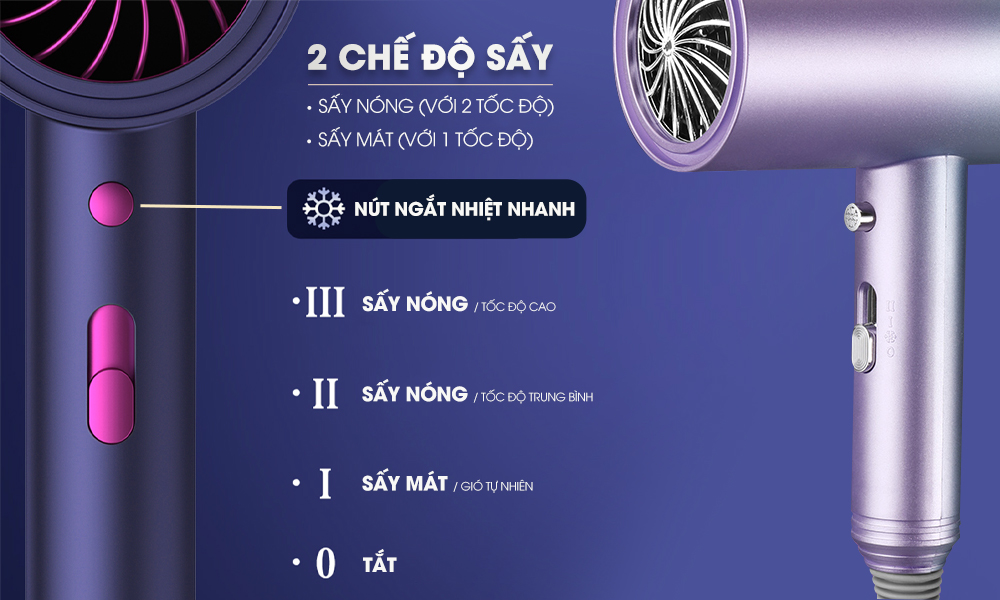 Với 2 chính sách sấy nóng ( 2 vận tốc ) và sấy mát ( 1 vận tốc ), người dùng tùy theo loại tóc, kiểu tóc để chọn vận tốc sấy tương thích, ngoài những máy có nút ngắt nhiệt nhanh giúp chuyển trong thời điểm tạm thời từ chính sách sấy nóng sang sấy mát mà không cần biến hóa chính sách, đây là tính năng chỉ có ở những dòng máy sấy tóc tạo kiểu hạng sang, chuyên nghiệp .
