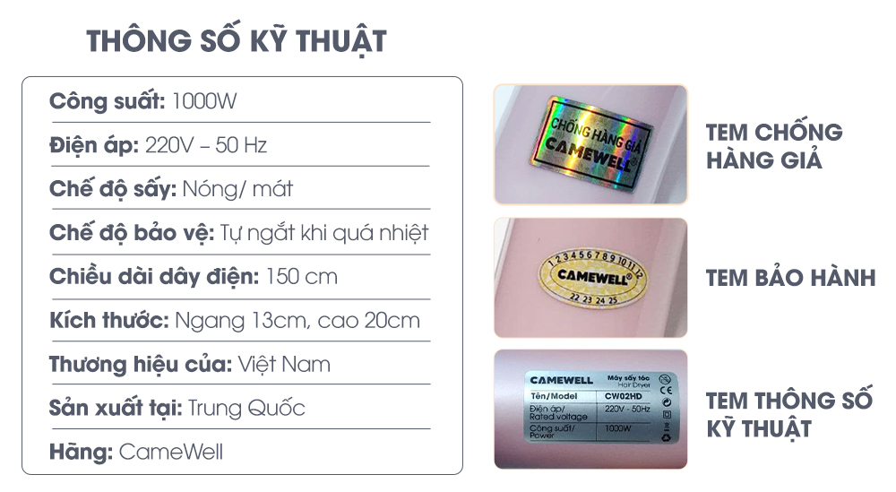 ***Máy sấy tóc chính hãngthương hiệu CameWell đã được đăng ký đạt quy chuẩn kỹ thuật quốc gia về an toàn đối với thiết bị điện và điện tử (QCVN4:2009/BKHCN) và quy chuẩn kỹ thuật quốc gia về tương thích điện từ đối với thiết bị điện và điện tử gia dụng (QCNV9:2012/BKHCN)