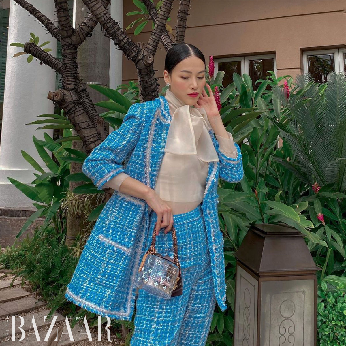 Bạn cũng hoàn toàn có thể chọn mẫu áo khoác bằng vải tweed như hoa khôi Trái đất Phương Khánh. Phối cùng quần đồng điệu hay với quần palazzo vải suôn đều đẹp .Tạp chí thời trang Harper’s Bazaar Việt Nam